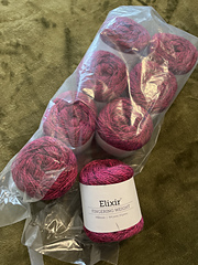 Vibrantly dyed Merino and alpaca are blended with black linen to create this unique fingering-weight heather. Knitted up, it creates a lightweight, airy fabric that is surprisingly substantial and cozy when worn. Elixir is well-suited for shawls and other accessories. Lace projects can be extensively stretched while blocking to create gorgeous open work, and the sturdy linen content in the fiber blend adds strength to delicate looking projects.