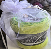 This is rather interestingly textured. It is made up of 4 strands of very fine (cobweb) 2-ply. The 4 strands are not twisted together. They have a cute little wood button with the 4 strands held together to get you started. So technically it is 4 x 2-ply