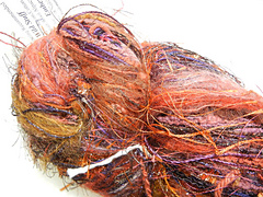 Wild Stuff is composed of 30-40 different hand dyed, gauge coordinated yarns. They are tied together end to end by hand, so that as you knit the texture and colors are always changing. Wild Stuff has a lot of eyelash, metallic, and other highly textured yarns. Wild Stuff has some wool, kid mohair and other animal fibers in it.