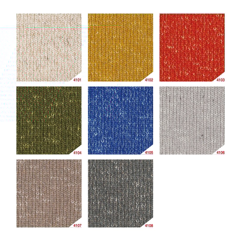 This is a design yarn made by twisting together yarns of different materials and shapes, such as brushed yarns, slub yarns, and neps. When knitted, the characteristics of each yarn give it a kasuri look, and combined with the Japanese pattern-like colors, it gives a retro feel. The light yarn will give you a light finish regardless of the knitting method or item.