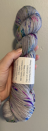 The yarn base is a 4-ply that is very soft and springy. This yarn is superwash and can be machine washed on gentle, but it is recommended to wash by hand to preserve the life of your garment. One skein is enough for a pair of adult socks or shawlette.